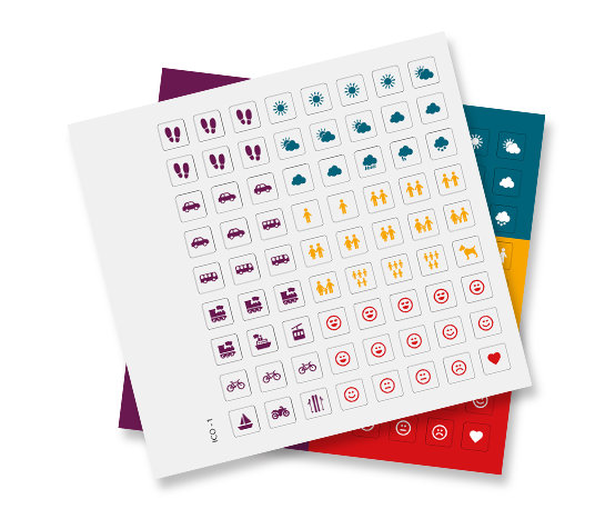 Kleine Aufkleber zur Ergänzung der Aufzeichnungen im Wander Sticker Album oder im klassischen Touristischen Tagebuch. Die Icons bieten Motive wie Verkehr, Wetter, Gesellschaft und Bewertung an.